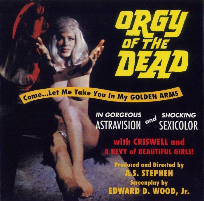Ed Wood vstává z hrobu a přináší svědectví o tom, co čeká duše smilných žen po smrti. Konkrétně musí bez přestání a bez svršků vlnit svá těla v rytmu unylých melodií pro potěchu vládce mrtvých a jeho suitu tvořenou přízrakem v černém, vlkodlakem a mumií. Pokud vám popsané bezkontaktní orgie nepřijdou nijak děsivé, vězte, že tato troufalost by se vám mohla stát osudnou. Orgie mrtvých totiž představuje jeden z naprosto nejhorších filmů všech dob. Ačkoli láká na příslib obnažených ženských těl natřásajících se mimo rytmus (během natáčení totiž tanečnicím pouštěli jinou hudbu, než jaká zní ve filmu), v paměti utkví především ryze nonsensové dějové sekvence prodchnuté uhrančivou demencí a fušerstvím všech zúčastněných. Ačkoli Ed Wood se na snímku podílel pouze coby autor scénáře, který napsal podle vlastní knižní předlohy, režijně debutující uprchlík z Bulharska Stephen C. Apostolof dělá mistrově odkazu všechnu čest. Znalce žánru naláká přítomnost profesionálního šarlatána a aktéra z klasiky Plán 9 z vnějšího vesmíru (1959) Criswella, jenž svým viditelně vychlastaným a senilním hereckým projevem názorně ukazuje smutný osud mnohých béčkových hvězd. Protiváhou vůči vymletému alkoholikovi s hošíkovskými kadeřemi bude „exotická tanečnice“ Pat Barrington, která si zde střihla dokonce dvojroli. Své nadlidsky toporné herectví předvede coby hlavní hrdinka s hrůzostrašnou rudou parukou ala Peggy Bundy. O jejích opravdových kvalitách nicméně svědčí fakt, že si ji posléze do Mondo Topless (1966) vybral největší filmový estét přes ženské křivky Russ Meyer. Barrington si proto v Orgii mrtvých střihla i part záhrobní tanečnice v části inspirované titulkovou sekvencí z bondovky Goldfinger (1964).