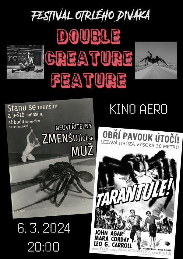 Na formát double feature už jsou diváci a divačky kina Aero zvyklí. Na otrlém dvojprogramu ale půjdeme rovnou k jeho kořenům – do amerických padesátých let, kdy béčková černobílá hrůza přicházela do kin ve dvojitém balení a doprovázely ji předfilmy o atomové energii, reklamy na předražený popcorn, hot dogy a colu v kinostánku, pozvánky do místní ZOO, animované varování před řízením pod vlivem alkoholu nebo tombola o hodnotné ceny. Náš double creature feature tak nabídne dva klasické monster filmy přemostěné kolekcí bizarních přestávkových spotů a dalšími vychytávkami, které patřily ke koloritu tehdejších dvojprojekcí. Komponovaný večer začneme traktátem o mrzké lidské malosti Neuvěřitelný zmenšující se muž a po zábavnými vsuvkami vyplněné přestávce nastoupí přerostlá lezavá hrůza jménem Tarantule.